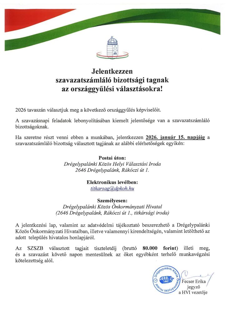 Tájékoztatom, hogy Hont Község Önkormányzatának Képviselő-testülete a 9/2025. (II.12.) számú határozatával 2025. december 29-től 2025. december 31-ig téli igazgatási szünetet rendelt el a Drégelypalánki Közös Önkormányzati Hivatalban. Az igazgatási szünet alatt a Drégelypalánki Közös Önkormányzati Hivatal és kirendeltségei zárva tartanak, ügyfélfogadás nem lesz.